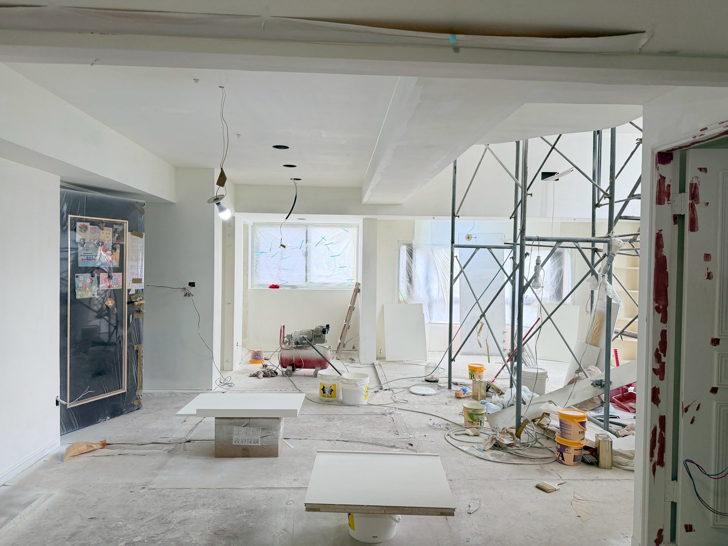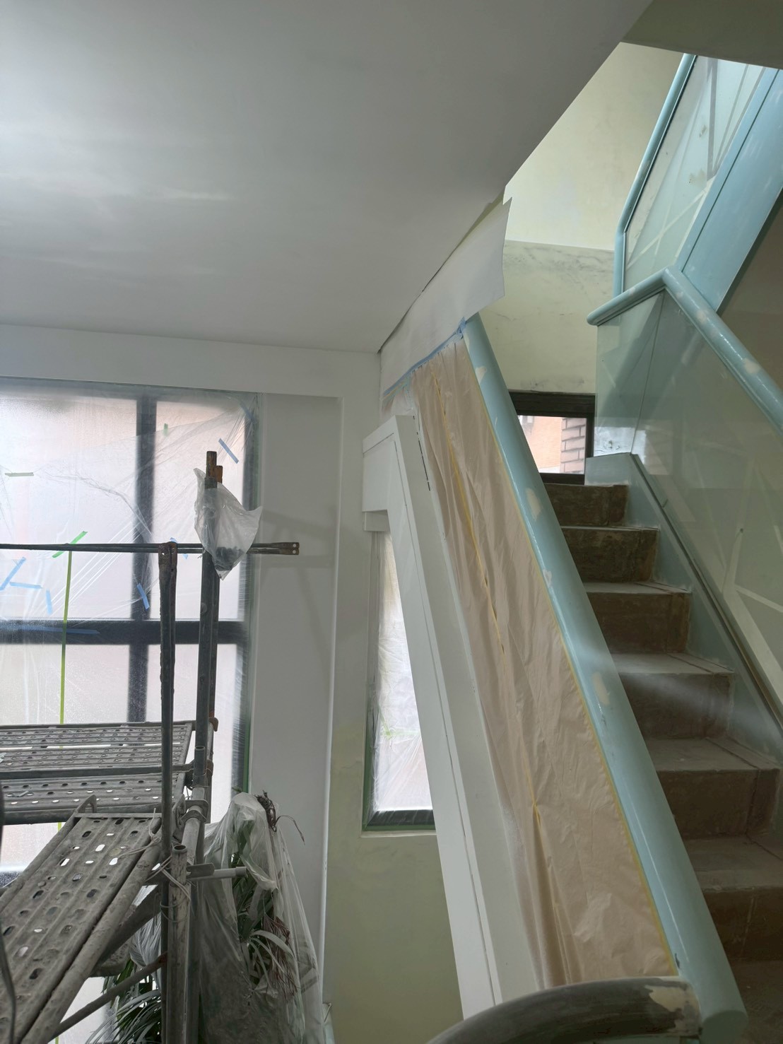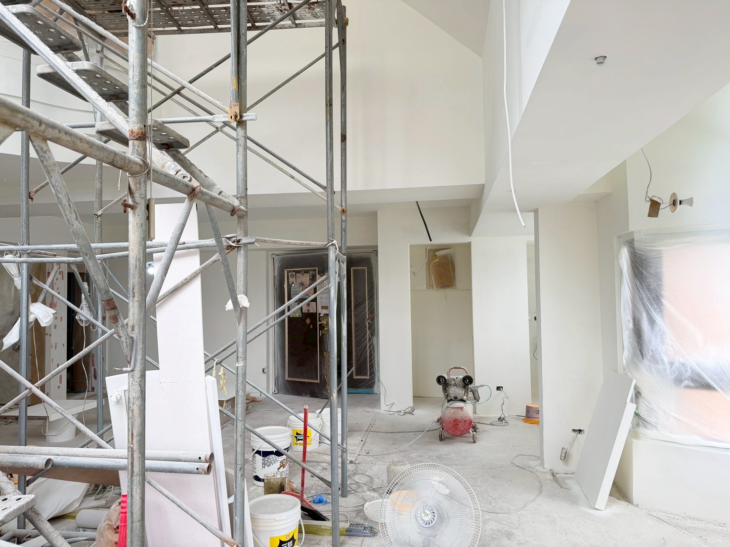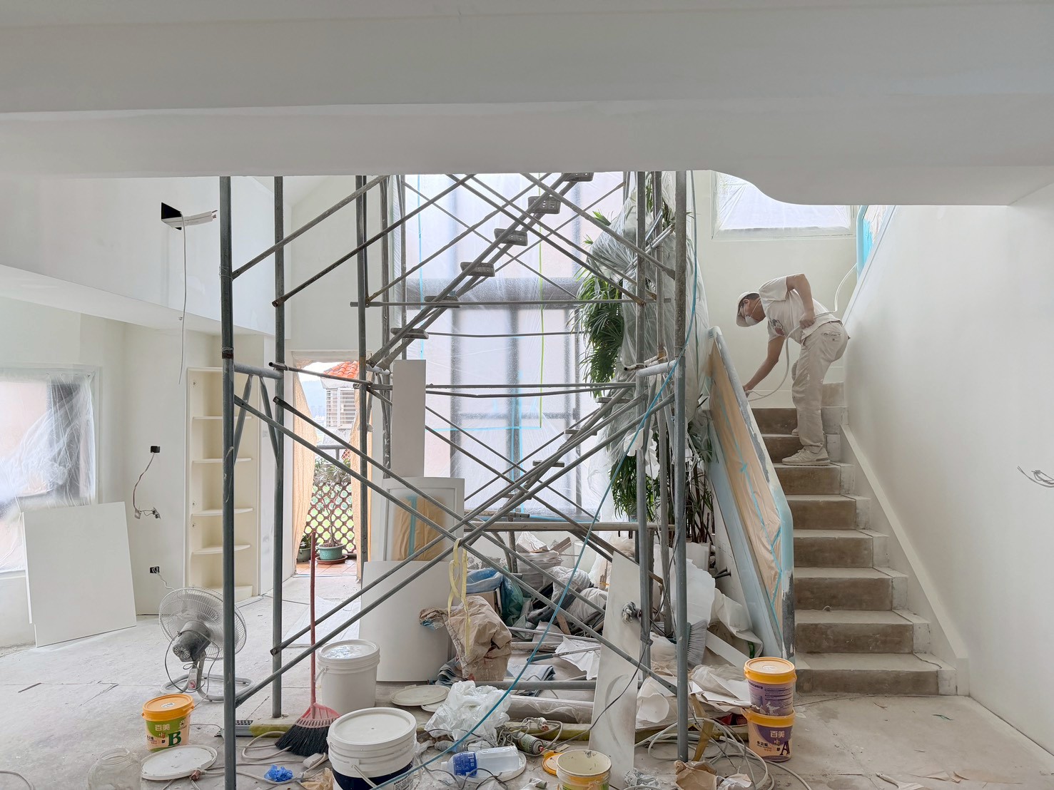 照片有點多,因為是一場大場的裝潢油漆粉刷跟烤漆工程,1樓又是挑高,天花板跟牆壁粉刷就需要搭鷹架來處理,門片需要一個個拆除下來補土上底色、噴漆、研磨、再噴漆,工序複雜,也是一個考驗師父的精細活。再來正常的保護措施要做的非常完美,這樣才能把油漆該烤漆或是噴漆,或是油漆粉刷的部分區分好保護好。