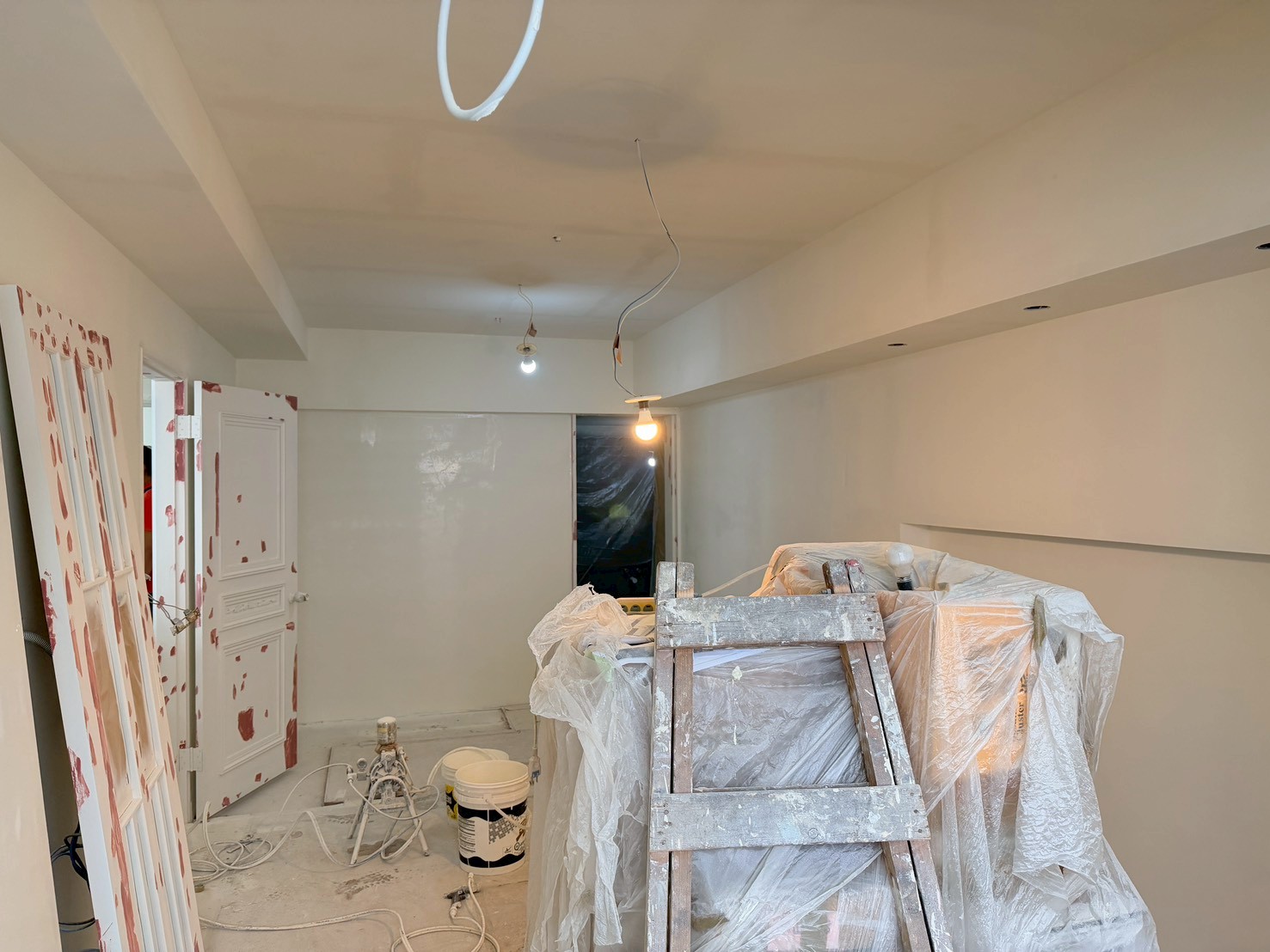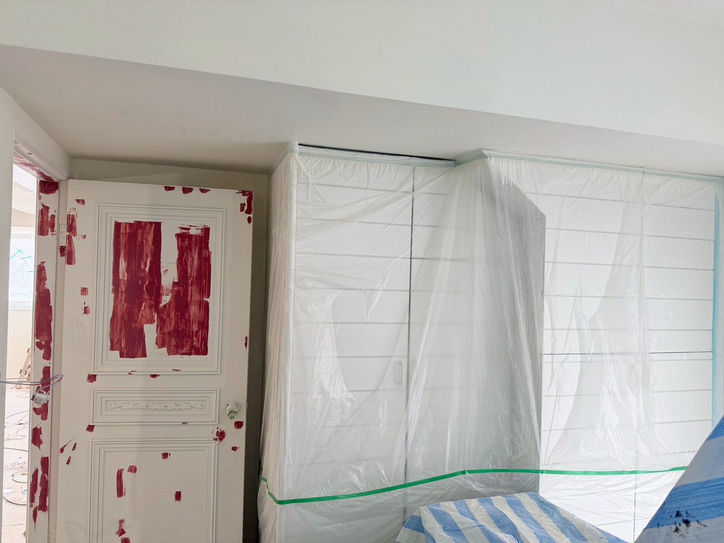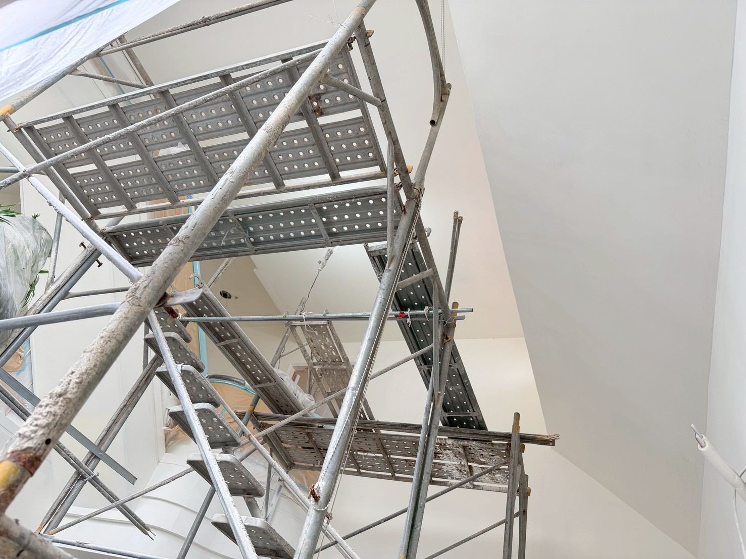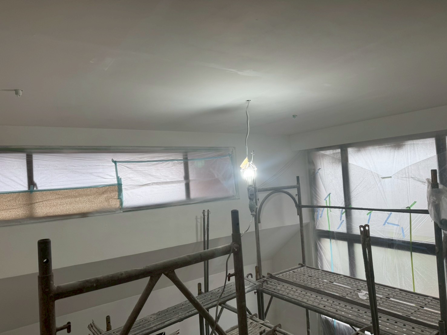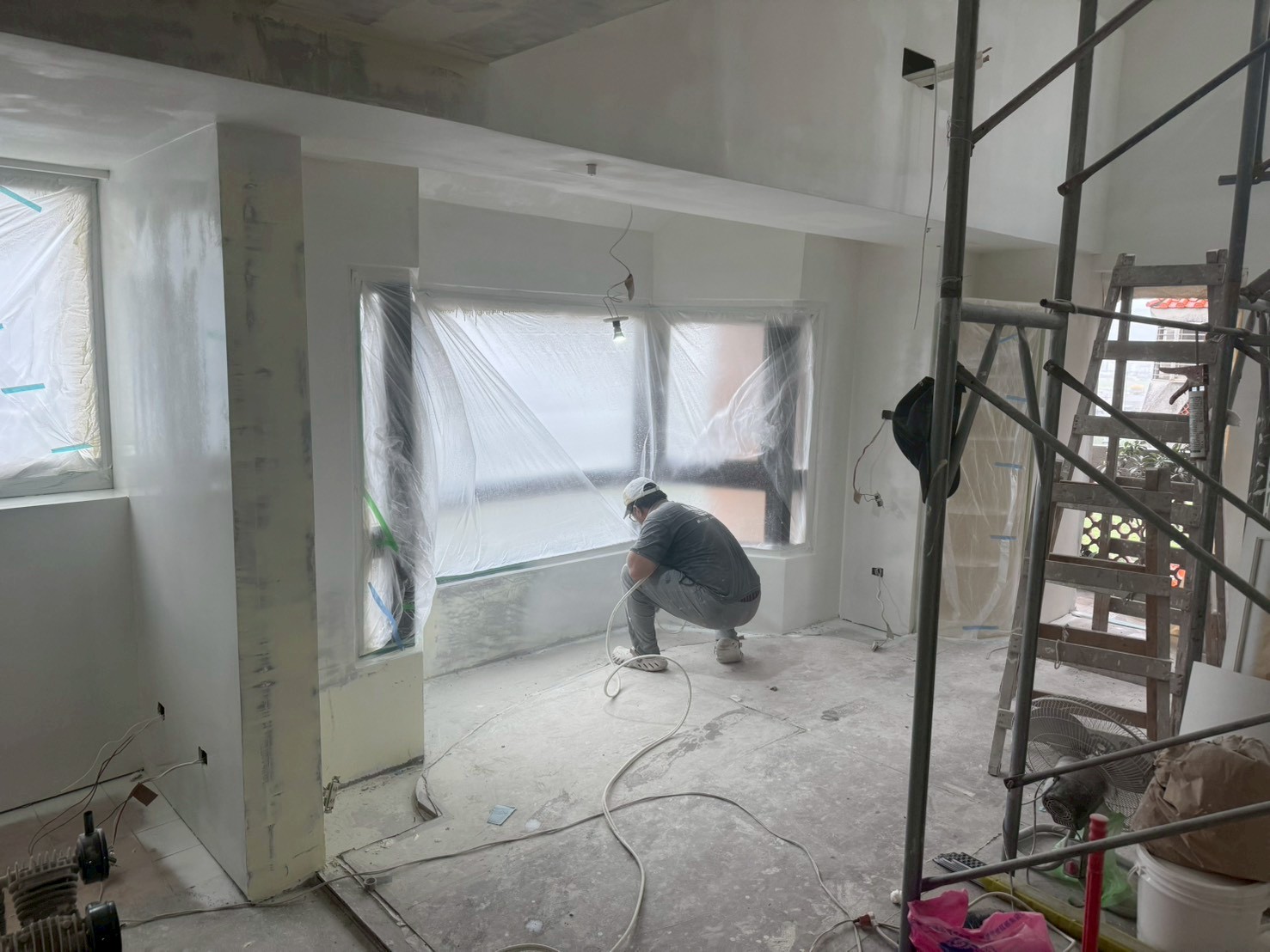 照片有點多,因為是一場大場的裝潢油漆粉刷跟烤漆工程,1樓又是挑高,天花板跟牆壁粉刷就需要搭鷹架來處理,門片需要一個個拆除下來補土上底色、噴漆、研磨、再噴漆,工序複雜,也是一個考驗師父的精細活。再來正常的保護措施要做的非常完美,這樣才能把油漆該烤漆或是噴漆,或是油漆粉刷的部分區分好保護好。
