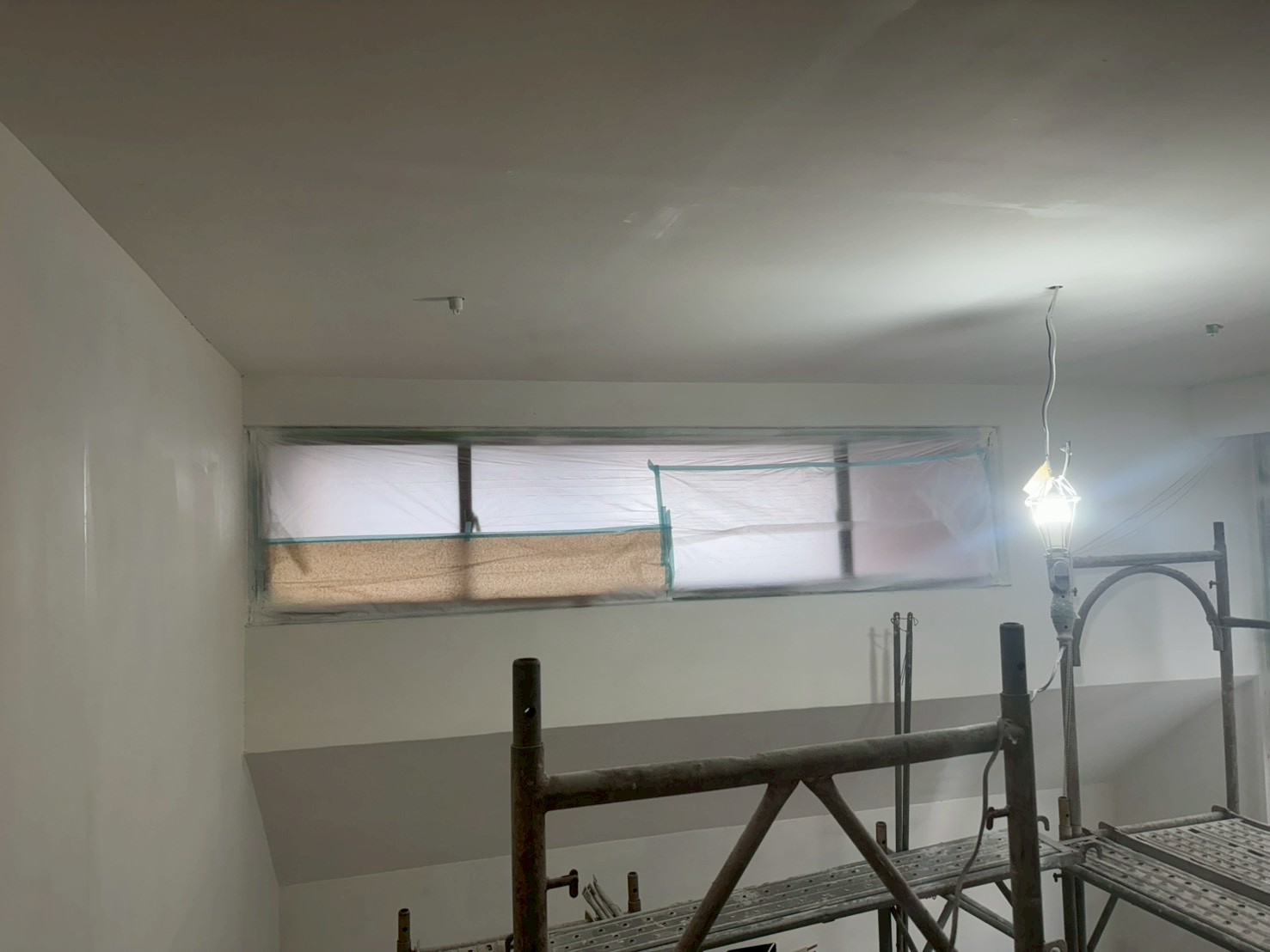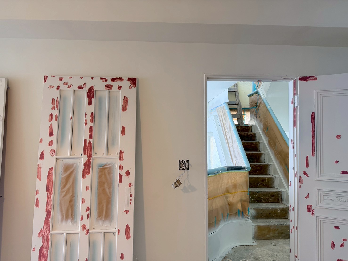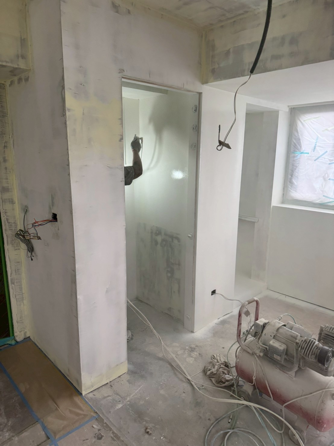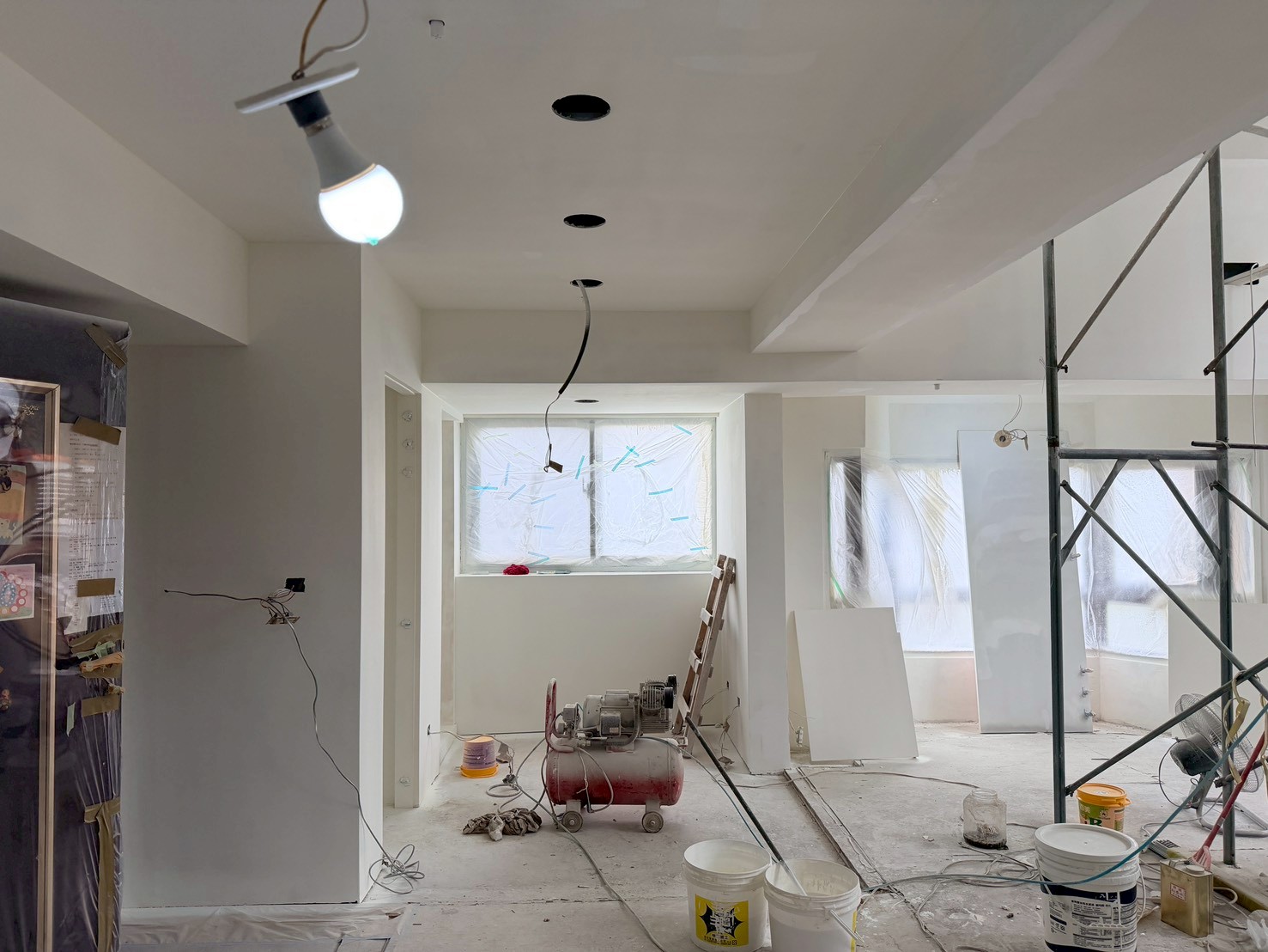 照片有點多,因為是一場大場的裝潢油漆粉刷跟烤漆工程,1樓又是挑高,天花板跟牆壁粉刷就需要搭鷹架來處理,門片需要一個個拆除下來補土上底色、噴漆、研磨、再噴漆,工序複雜,也是一個考驗師父的精細活。再來正常的保護措施要做的非常完美,這樣才能把油漆該烤漆或是噴漆,或是油漆粉刷的部分區分好保護好。