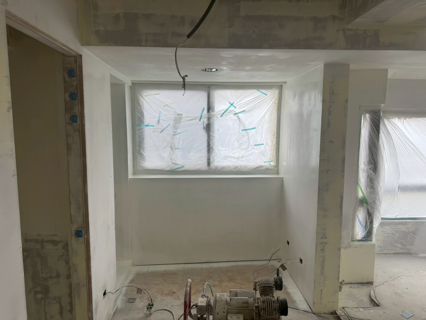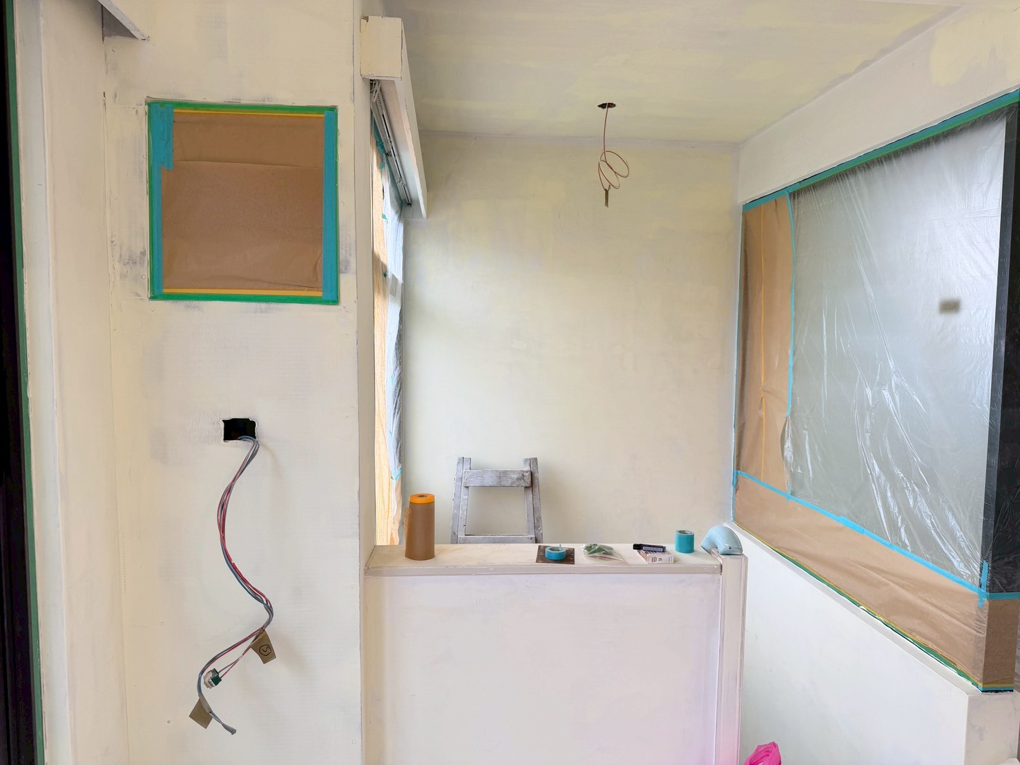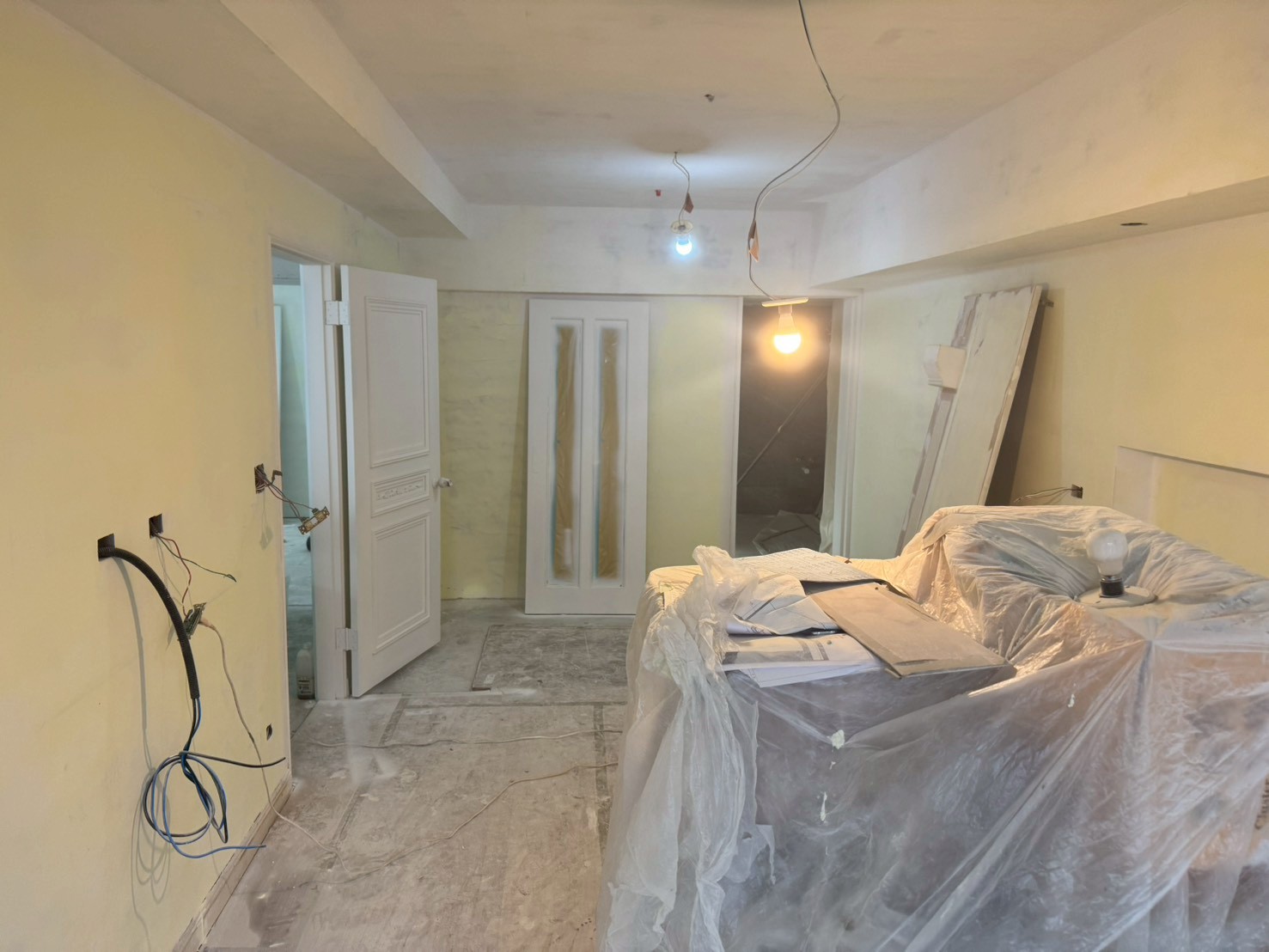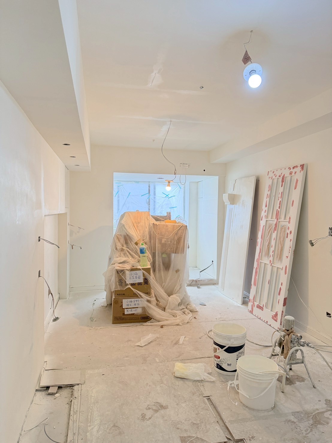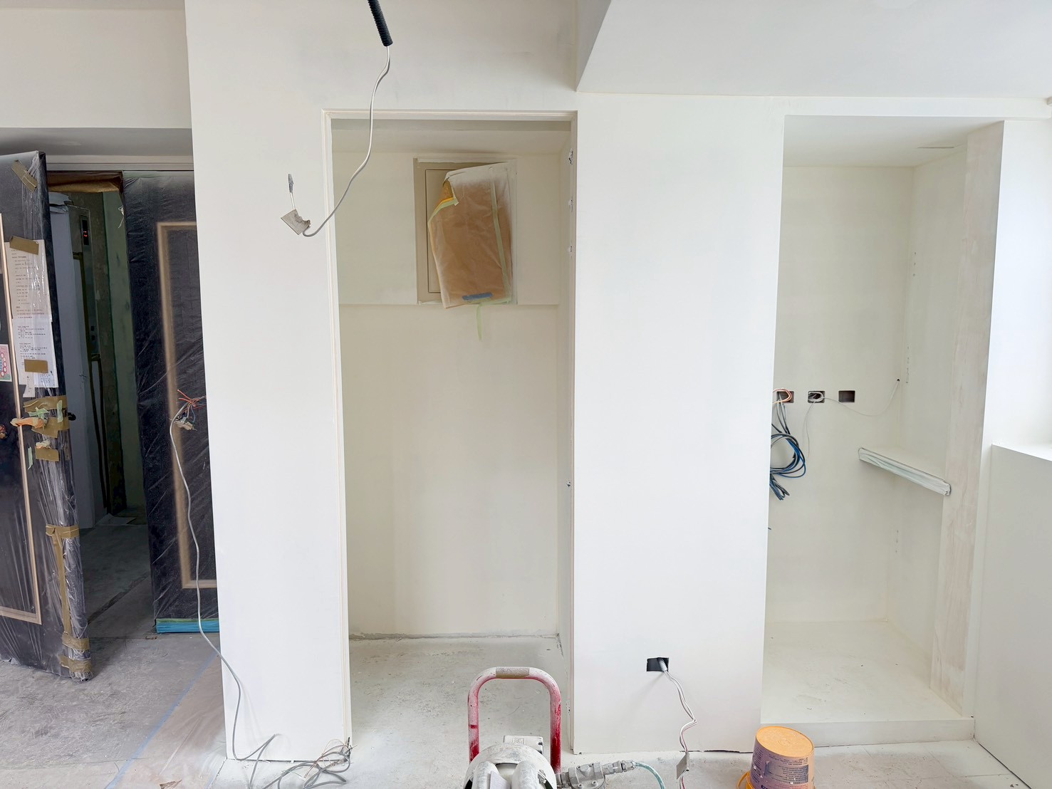 照片有點多,因為是一場大場的裝潢油漆粉刷跟烤漆工程,1樓又是挑高,天花板跟牆壁粉刷就需要搭鷹架來處理,門片需要一個個拆除下來補土上底色、噴漆、研磨、再噴漆,工序複雜,也是一個考驗師父的精細活。再來正常的保護措施要做的非常完美,這樣才能把油漆該烤漆或是噴漆,或是油漆粉刷的部分區分好保護好。