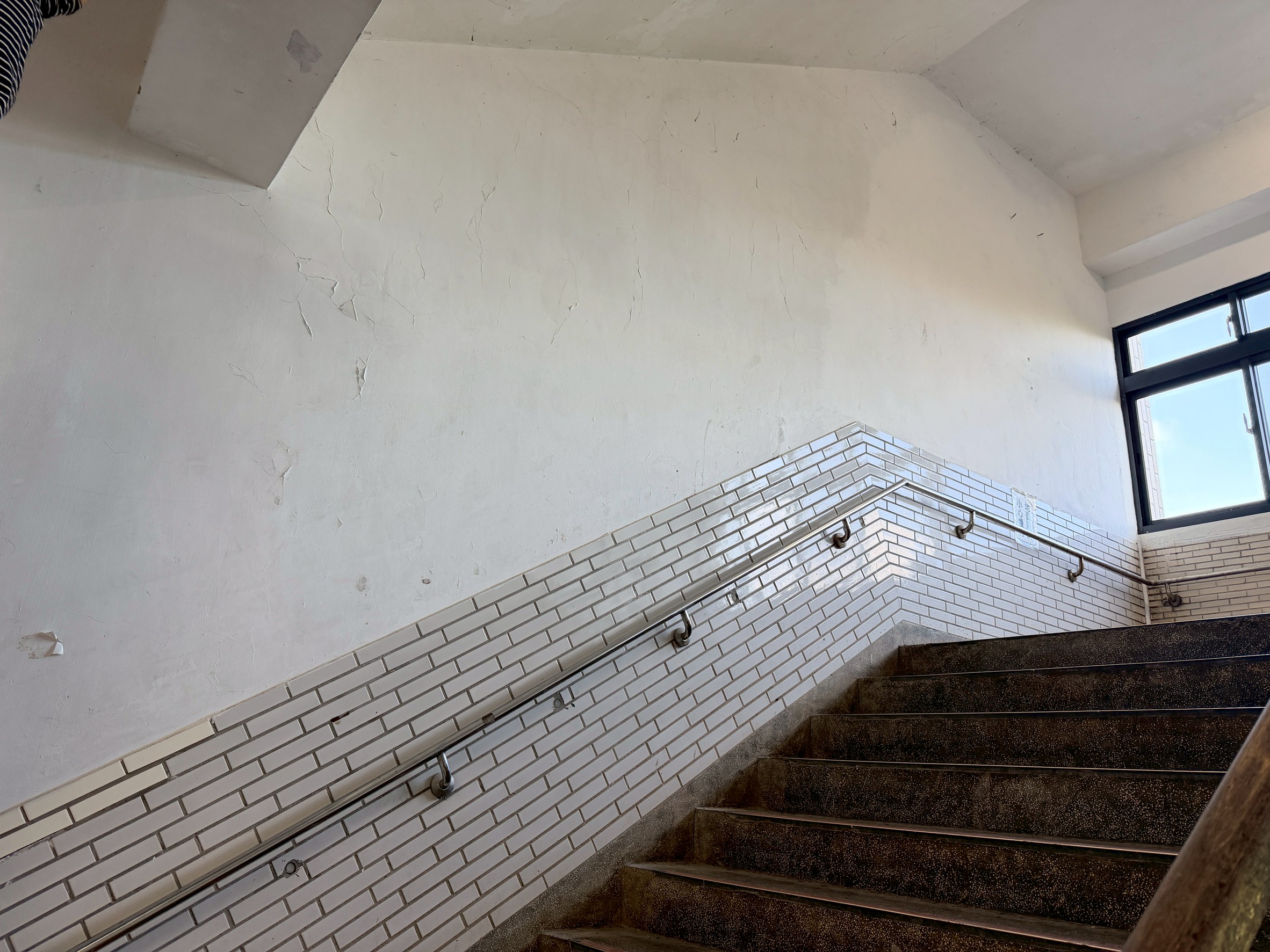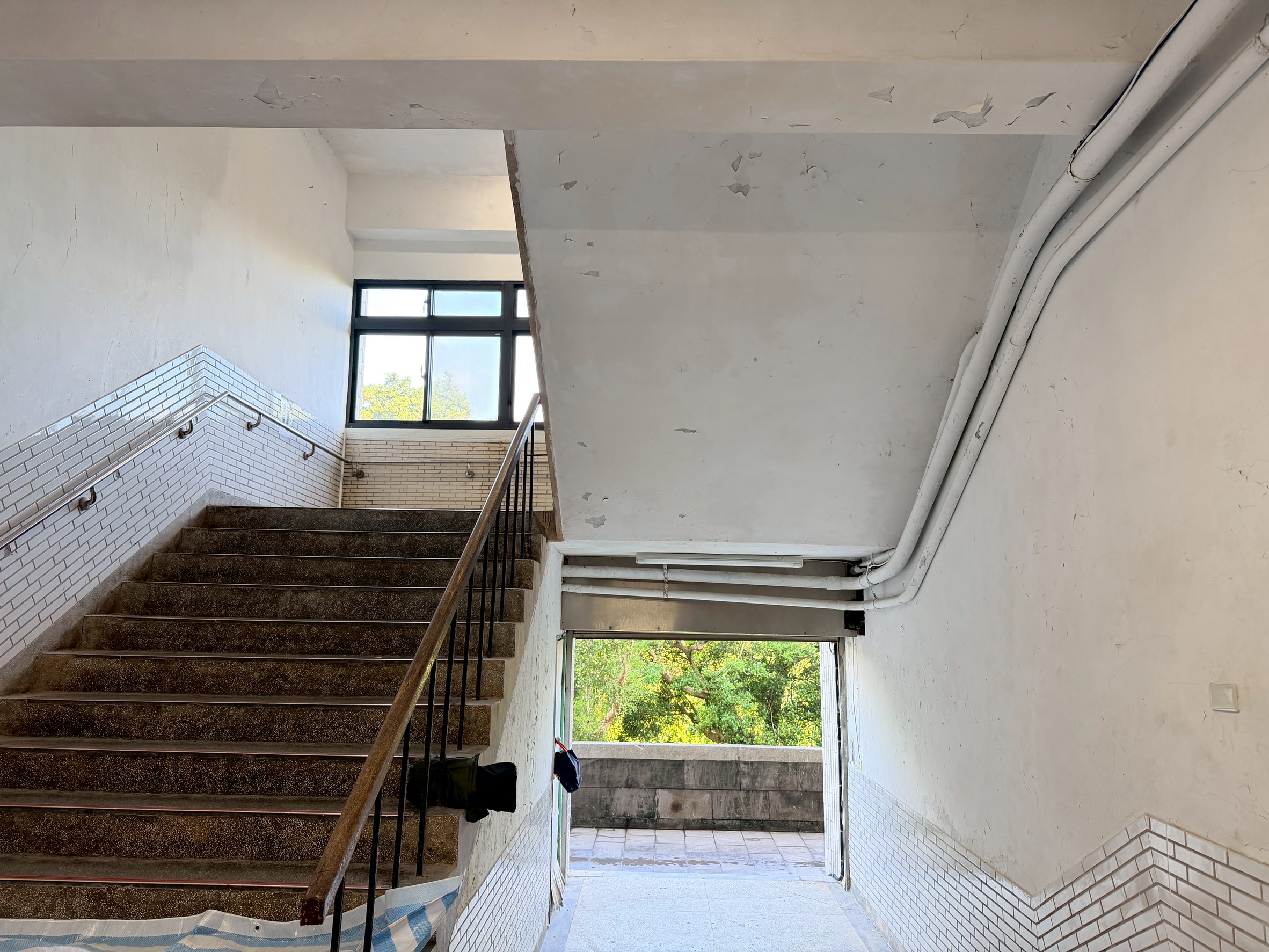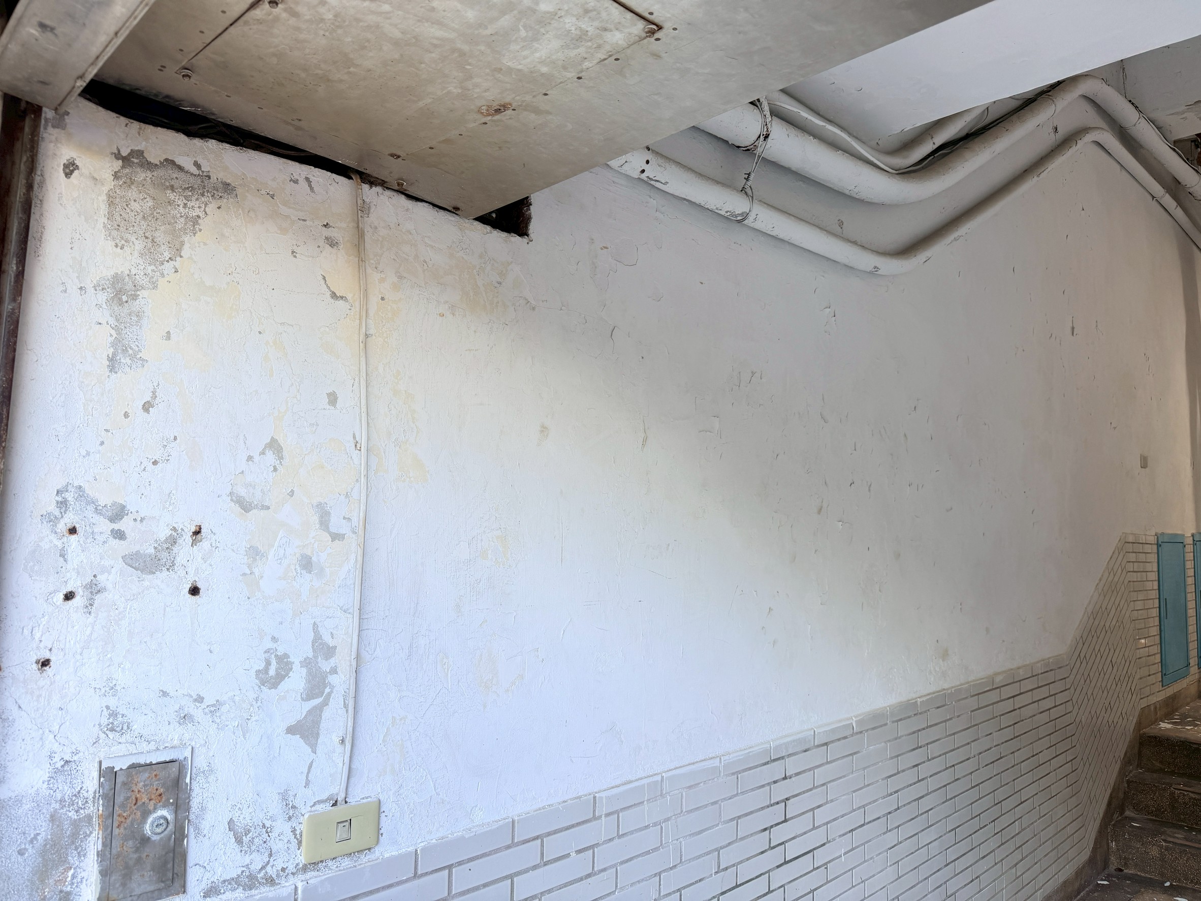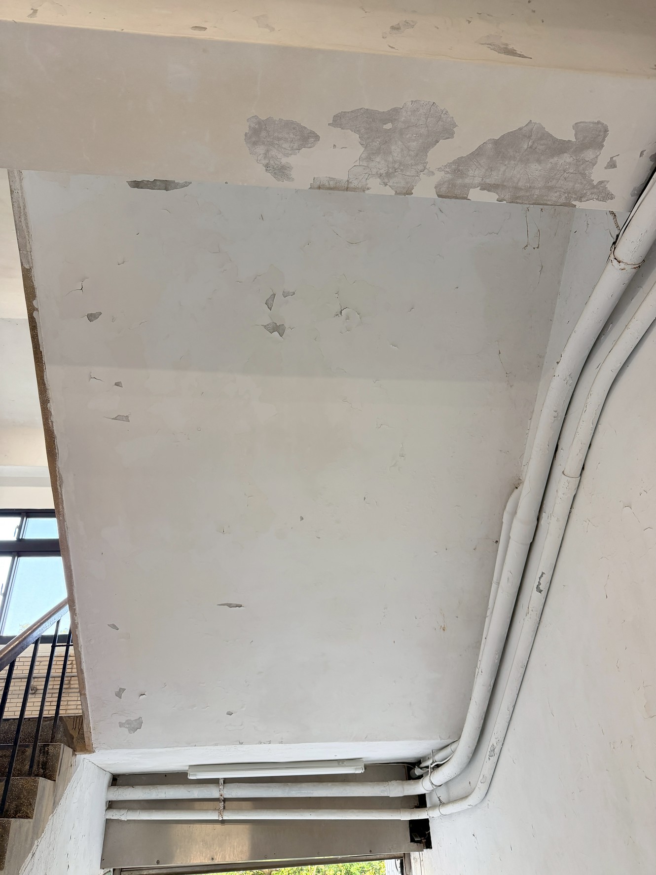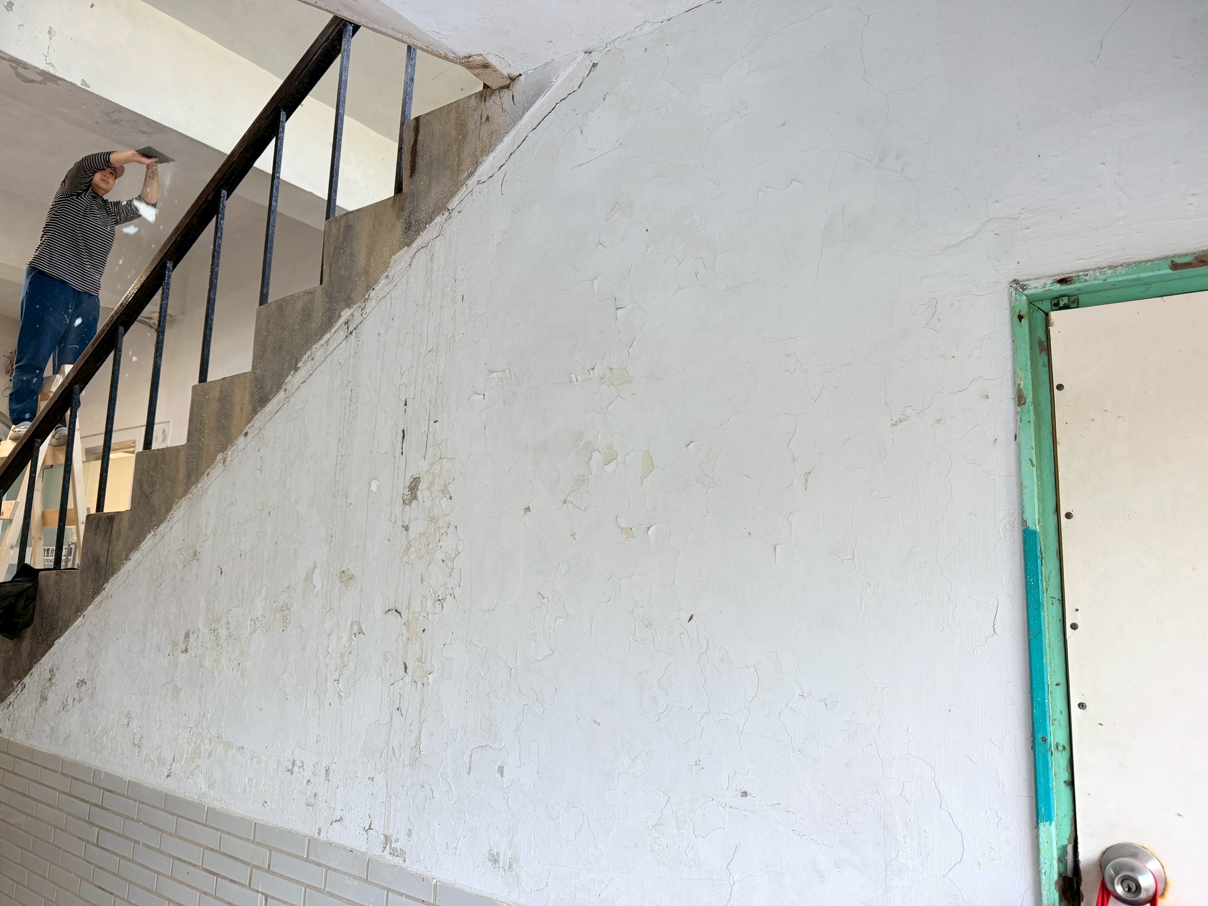 樓梯牆壁跟天花板很多都是嚴重油漆剝落,牆面清潔重新補水泥批土,粉刷乾淨。